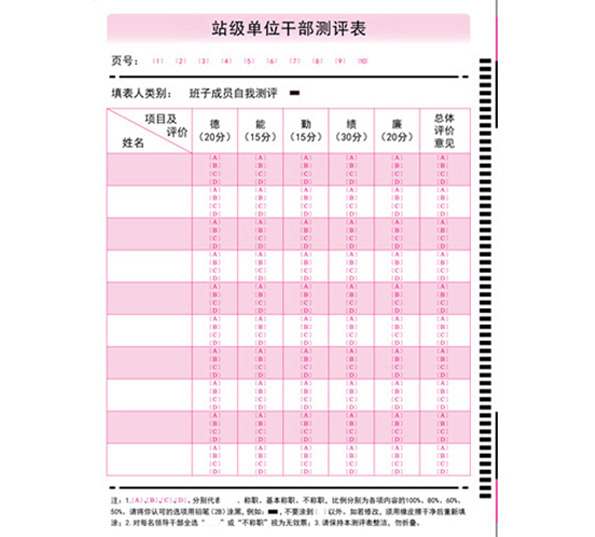 答題卡(又稱信息卡),是光標(biāo)閱讀機(jī)輸入信息的載體,是配套光標(biāo)閱讀機(jī)的各種信息錄入表格的總稱。信息卡將用戶需要的信息轉(zhuǎn)化為可選擇的選項(xiàng),供用戶涂寫(xiě)。OMR設(shè)備根據(jù)信息點(diǎn)的涂與未涂和格式文件設(shè)置將信息還原。